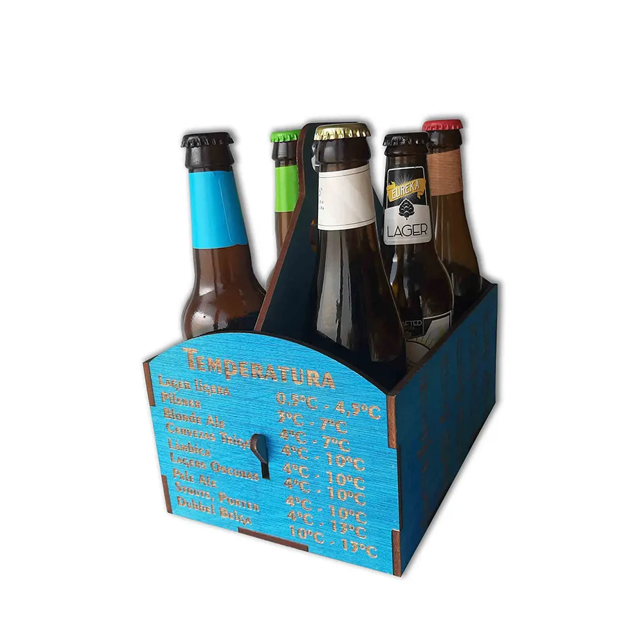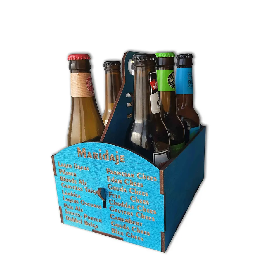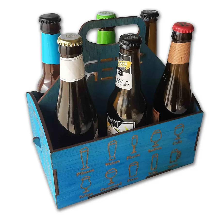 Cervecero Madera 6 Botellas Personalizado: Caja de madera diseñada para almacenar y presentar 6 botellas de cerveza de forma personalizada.