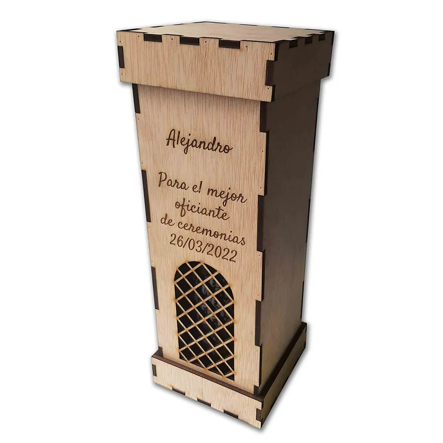 Caja Madera Botella Vino Capilla: Caja de madera especial para presentar y regalar una botella de vino en un diseño tipo capilla.
