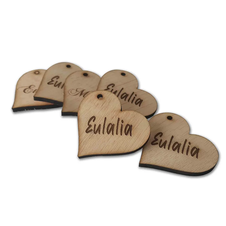 Marcasitios Corazón Madera: Marcasitios en forma de corazón fabricados en madera, perfectos para eventos y bodas.