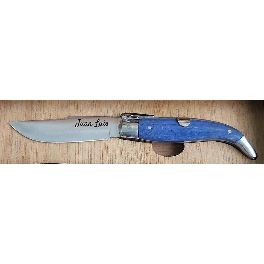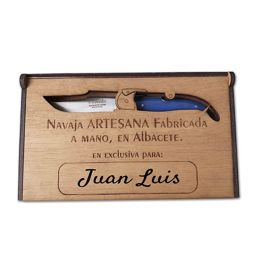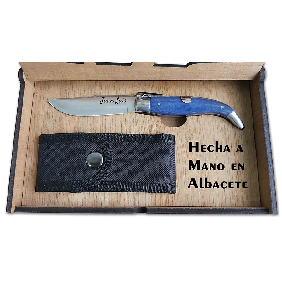 Navaja Mikarta Azul en Caja Madera Funda: Navaja con mango de mikarta azul presentada en una funda de madera.