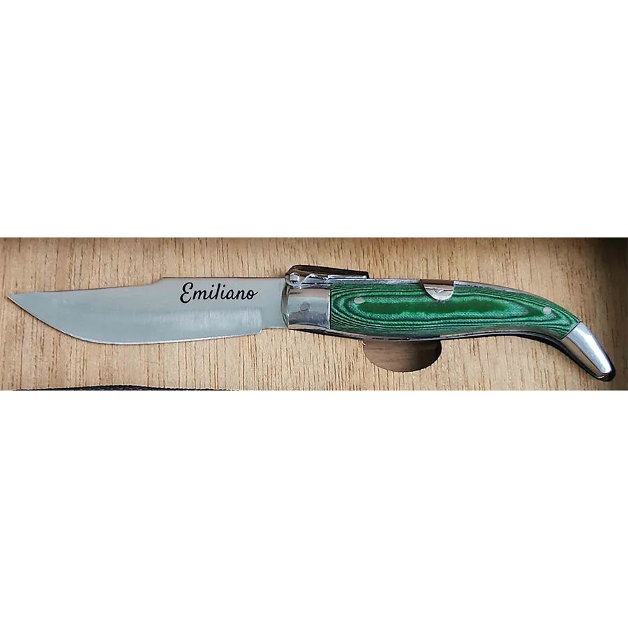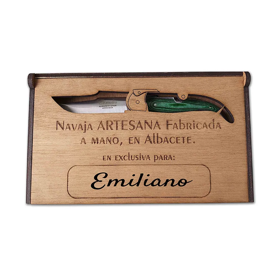 Navaja Mikarta Verde en Caja Madera Funda: Navaja con mango de mikarta verde presentada en una funda de madera.