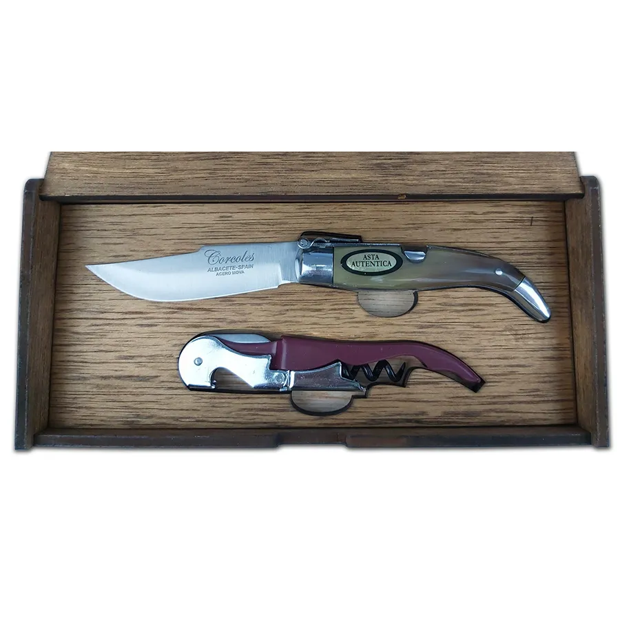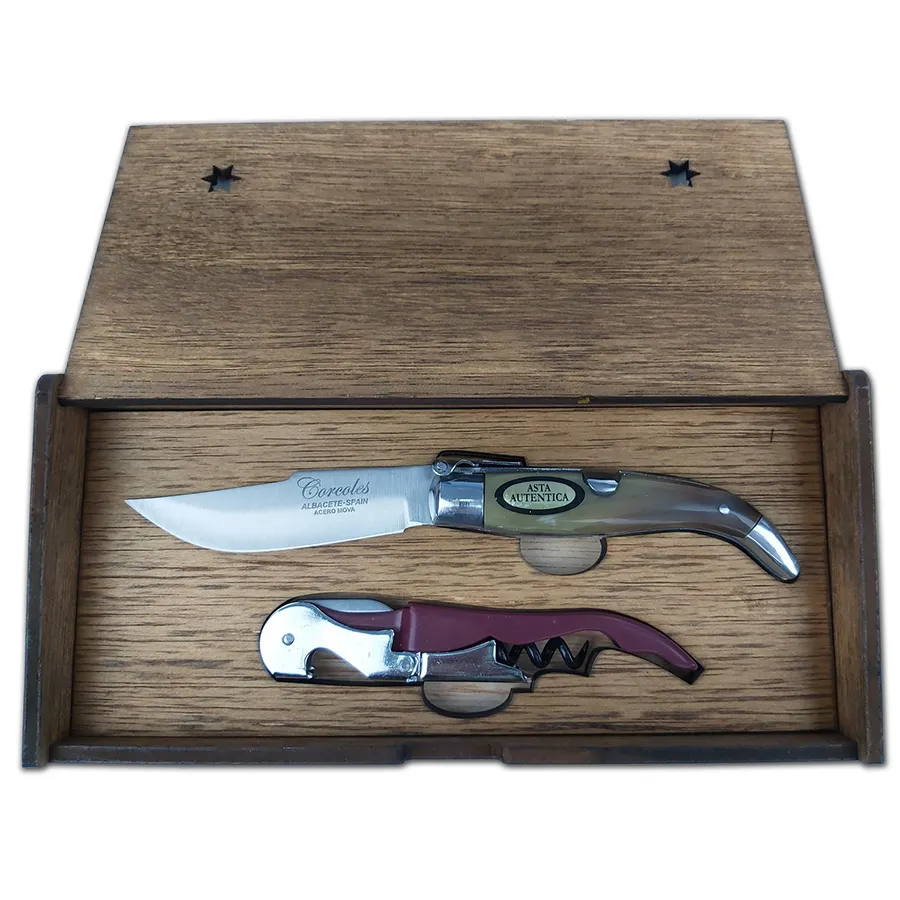 Navaja Toro Caja Madera Sacacorchos: Navaja con diseño de toro y sacacorchos, presentada en una caja de madera.