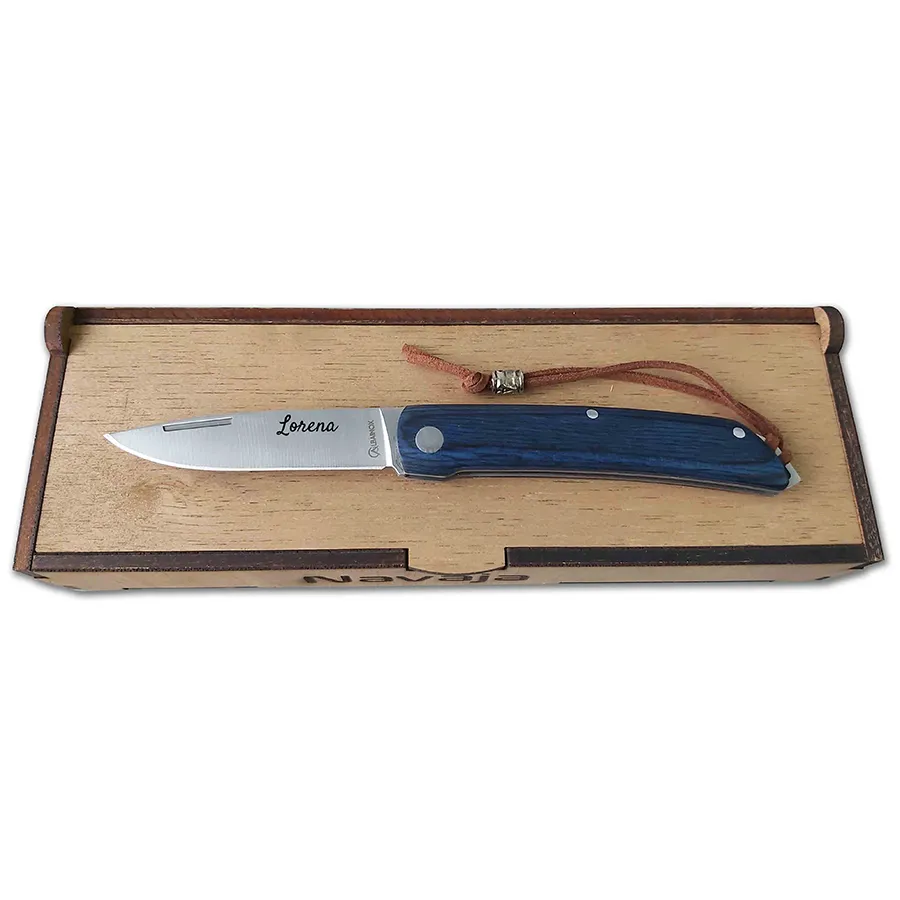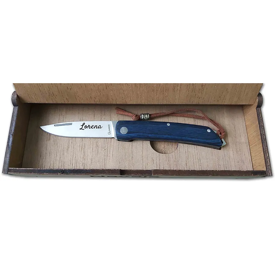 Navaja Deportiva Caja Madera Universal: Navaja deportiva presentada en una caja de madera de diseño versátil.